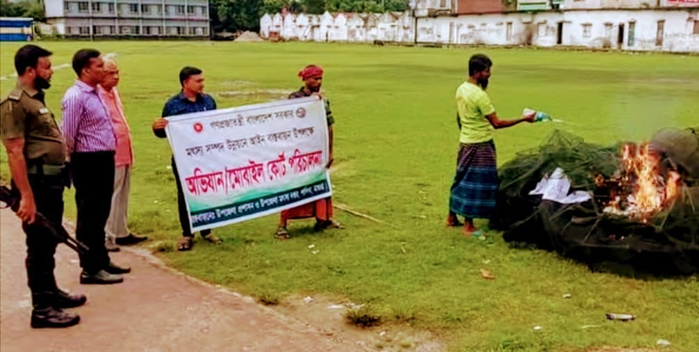 শালিখায় ২৪টি অবৈধ চায়না দুয়ারী জাল পুড়িয়ে দিল প্রশাসন।